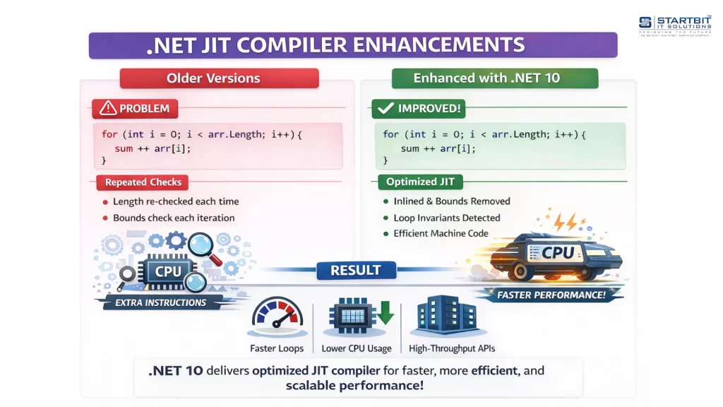 - Example: A simple Sum loop benchmark can execute ~3× faster in .NET 10.